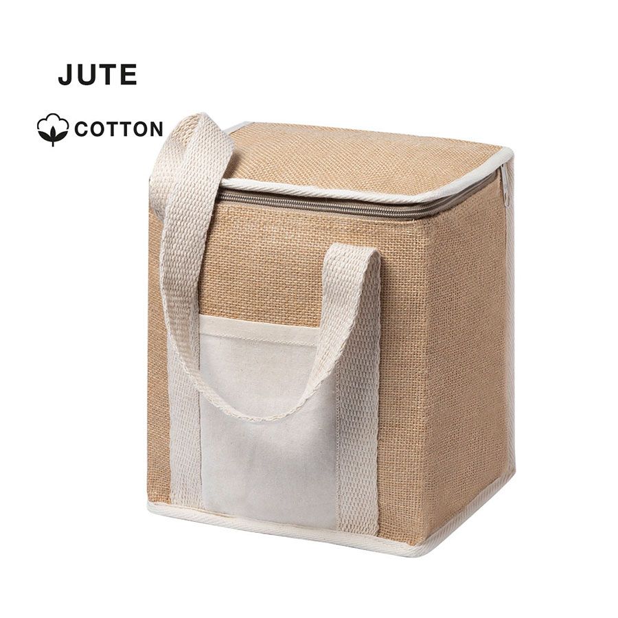 Высокая сумка-холодильник из влагостойкого ламинированного джута, с изотермической внутренней отделкой из алюминия. Хлопковые ручки и внешний карман для печати из хлопка.
