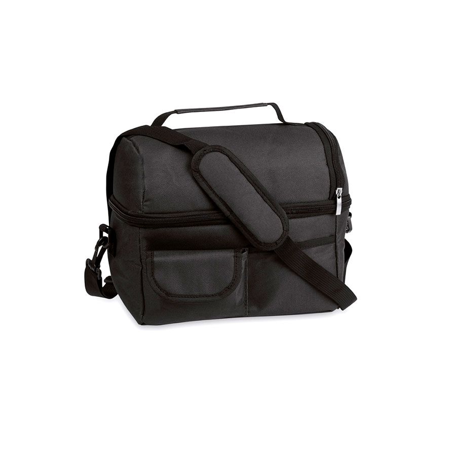 Универсальная сумка-холодильник из прочного полиэстера 600D с двумя независимыми отделениями на молнии. С 2 передними карманами, один из которых застегивается на липучку, а сзади - карман из эластичной сетки. Внутри изотермическое алюминиевое покрытием. Регулируемый плечевой ремень с мягкой подкладкой, с застежкой-карабином. Материал: полиэстер 600D PEVA
