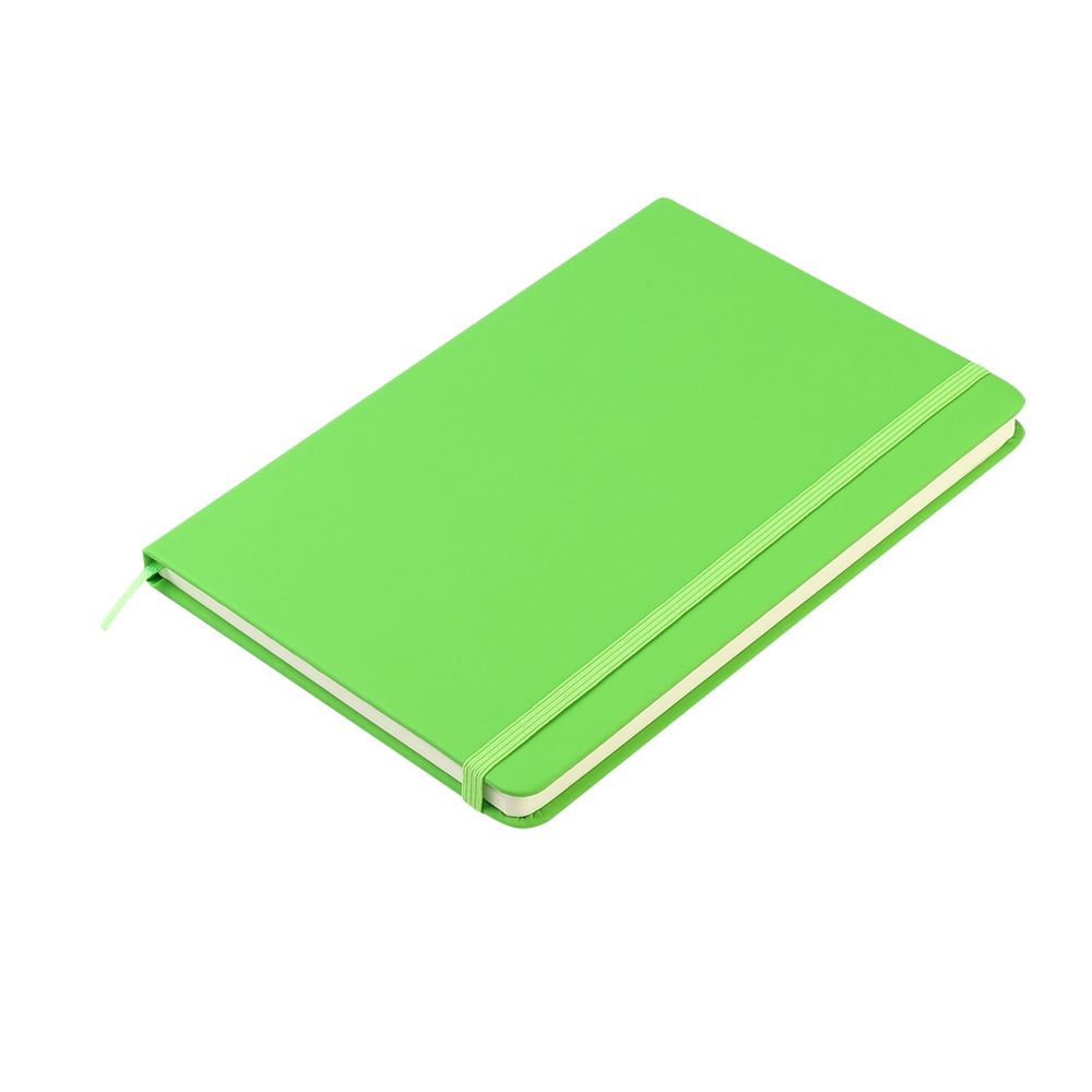Блокнот формата А5 с твердым покрытием из PU-материала с имитацией рисунка кожи, с эластичной застежкой для закрытия и текстильной закладкой в цвет блокнота, 192 страницы / 96 листов, плотность 70г/м, страницы с черными линиями. Цвет по PANTONE® (максимально приближен): 368C.