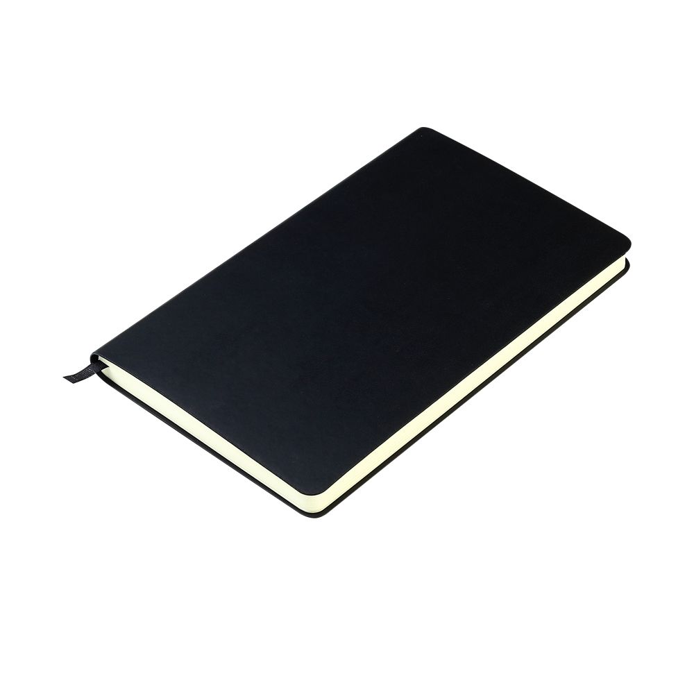 Блокнот формата А5 с мягкой обложкой из PU-материала, имеющего текстуру, имитирующую поверхность натуральной кожи; с текстильной закладкой в цвет блокнота, 256 страниц, плотность 70г/м, страницы с черными линиями.
