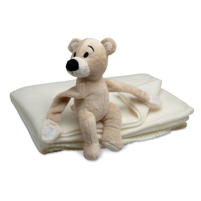 Флисовый детский плед с плюшевым мишкой, удерживающим одеяло.