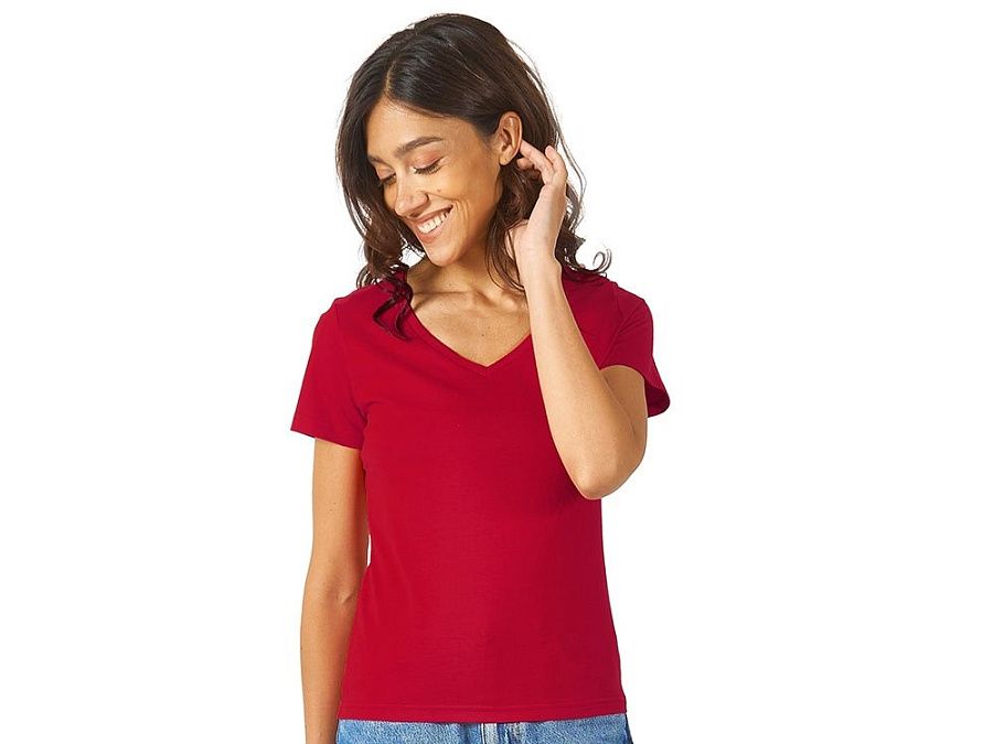 Женская футболка из натурального хлопка с элегантным V-образным вырезом. Материал отлично подходит для нанесения рекламной информации. Натуральная ткань не вызывает раздражения кожи.
