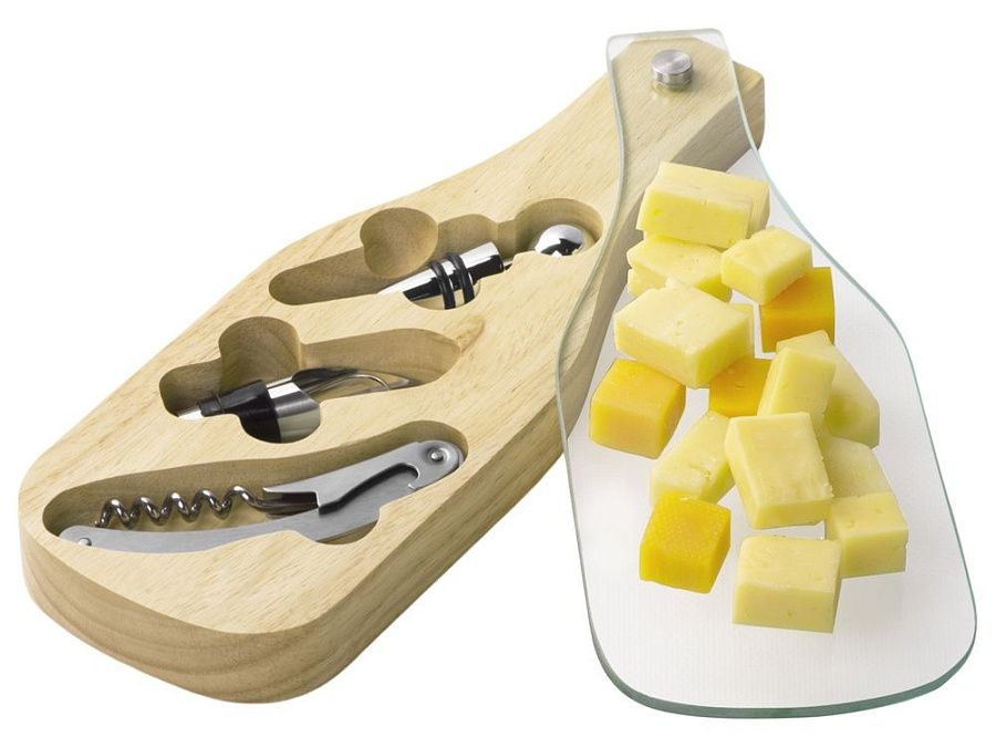 Футляр — в форме бутылки вина, что позволяет обыграть тему благородного напитка при помощи нанесения. Прозрачная стеклянная крышка может быть полностью запечатана УФ-печатью по желанию клиента, который наверняка оценит столь большое поле для нанесения. Кроме того, крышка может быть использована для сервировки на ней сыров или для их нарезки. За соприкосновение с пищей можно не переживать, для этого мы и продумали делать "зеркальную" печать на крышке с внутренней стороны.