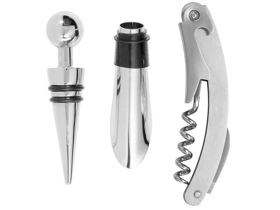 Деревянная часть футляра имеет три вырезанные ниши под каждое из приспособлений для вина, дополненные выемками под пальцы для удобного извлечения.