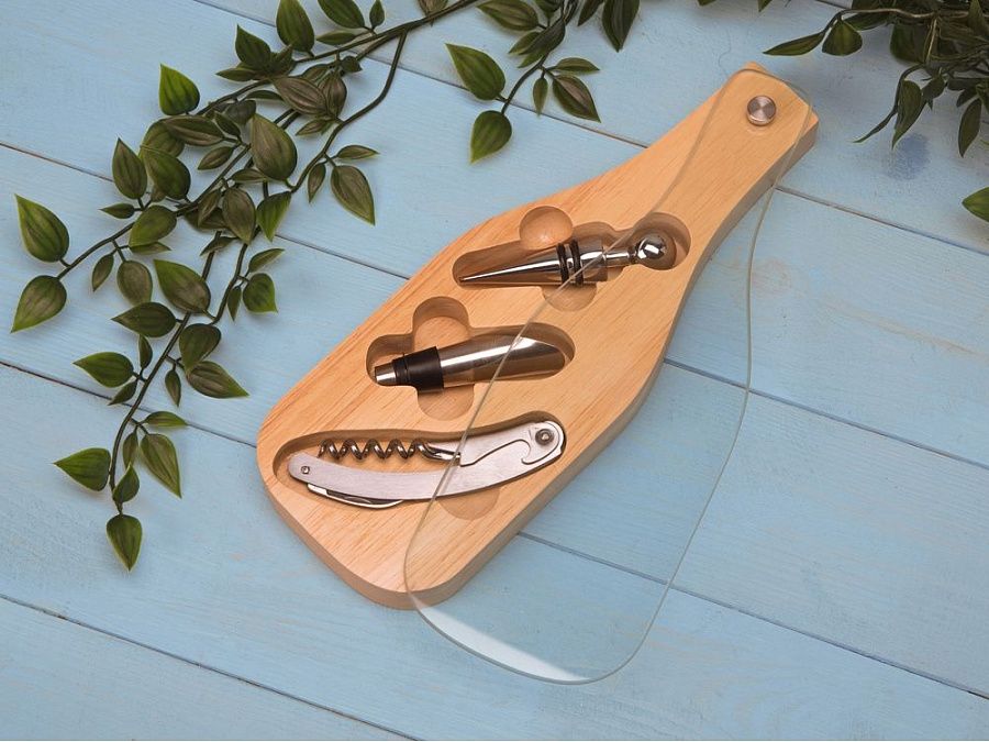 Набор аксессуаров для вина от Master of Wine выполнен в виде футляра из дерева со стеклянной крышкой с разместившимися внутри штопором, пробкой и аэратором.
