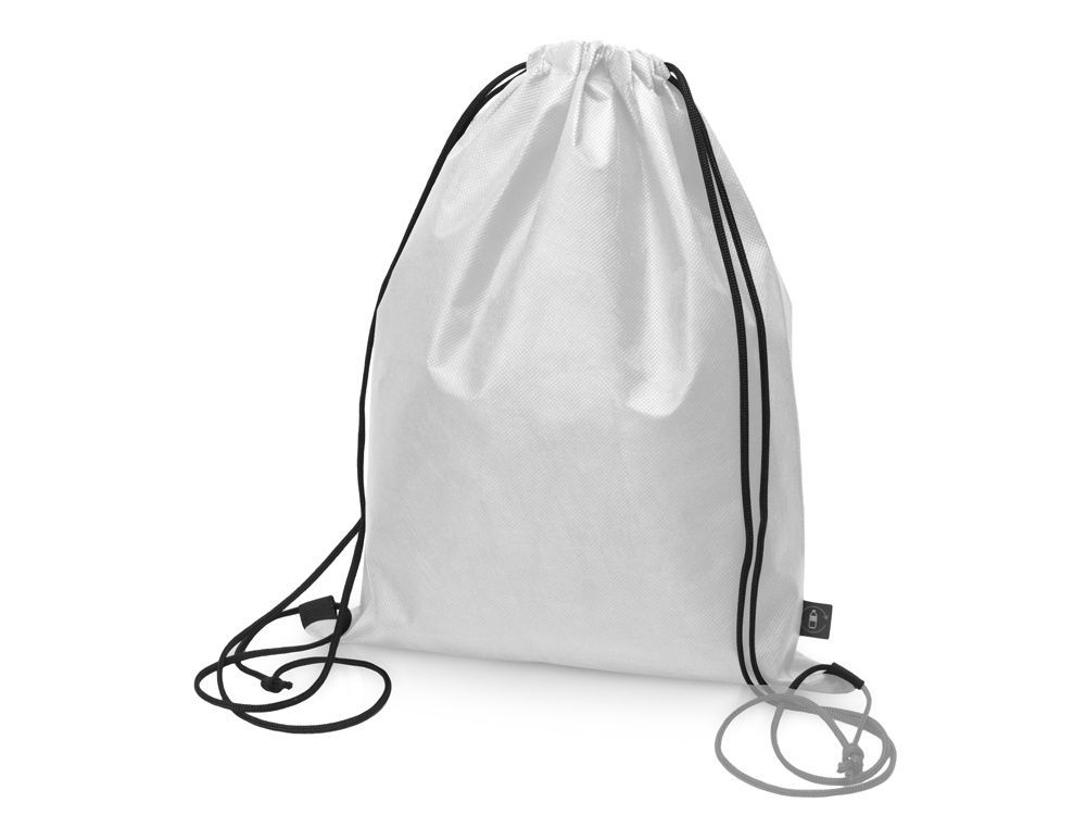 Рюкзак-мешок изготовлен из переработанного пластика. Затягивается с помощью двух боковых шнурков.