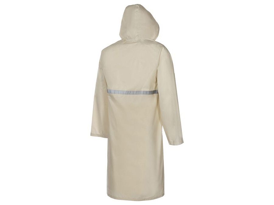 Длинный дождевик выполнен из полиэстера с водоотталкивающей пропиткой. Застегивается на молнию, поверх которой — планка на кнопках, что дополнительно защищает от ветра и промокания. Посадку капюшона можно регулировать при помощи шнурка, ширина рукава регулируется кнопкой.