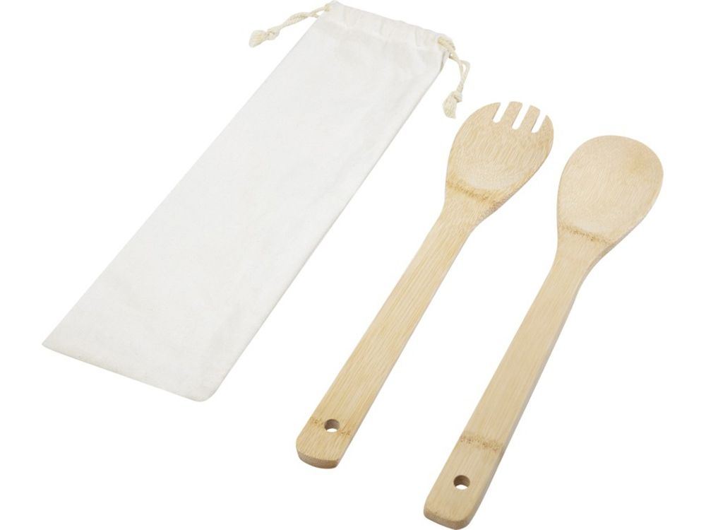 Бамбуковый комплект из салатной ложки и вилки, удобный для повседневных семейных ужинов. Используемый бамбук поставляется и производится в соответствии со стандартами устойчивого развития.