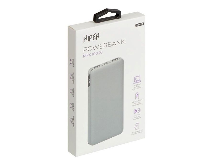 Портативный внешний аккумулятор HIPER MFX 10000 емкостью 10000 мАч (37Втч) оснащён двунаправленным портом USB-C, Micro-USB входом для зарядки, с поддержкой быстрой зарядки аккумулятора QC и PD, 2xUSB-A выходами, максимальный выходной ток 3.0А, максимальная мощность 18 Вт, поддержка быстрой зарядки стандарта QC 18 Вт, поддержка быстрой зарядки стандарта PD 18 Вт.