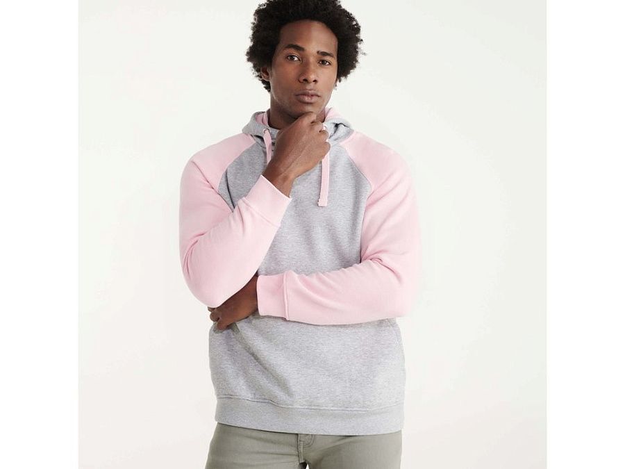 Худи с контрастным рукавом реглан. Капюшон с запахом, с контрастной подкладкой и шнурком. На полочке карман кенгуру. Манжеты рукавов и низ изделия из риба 1х1.