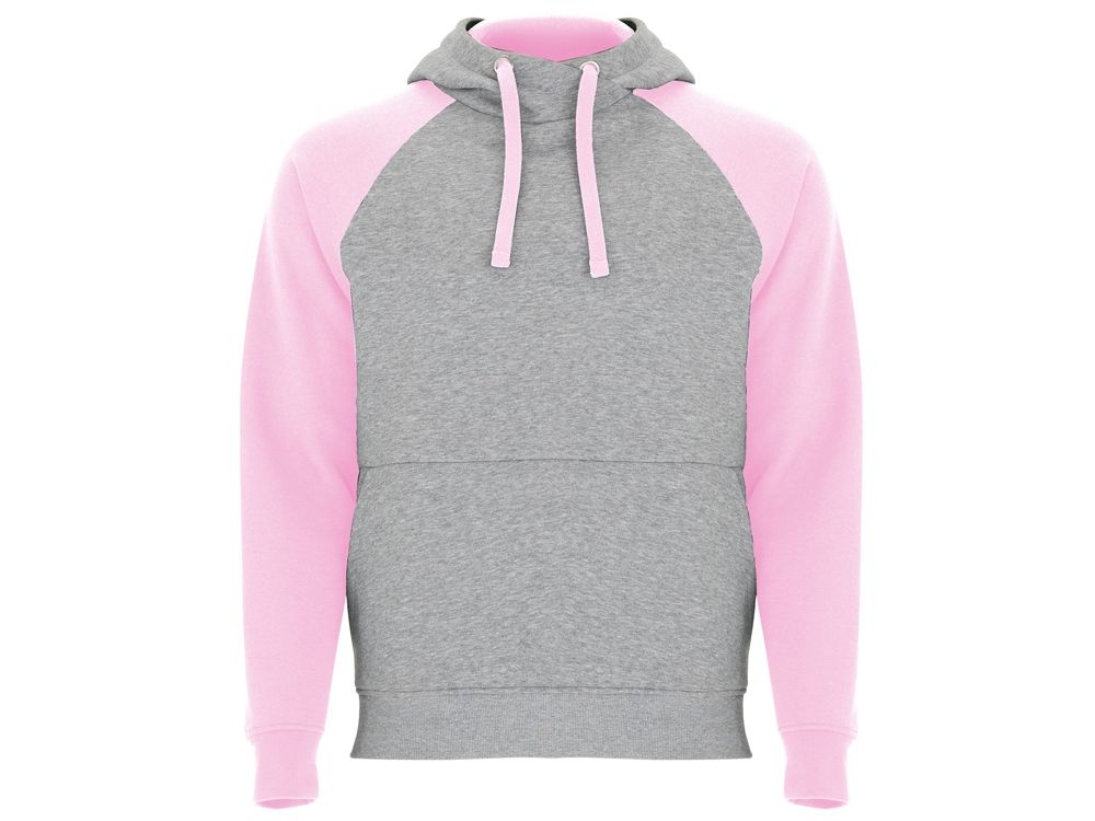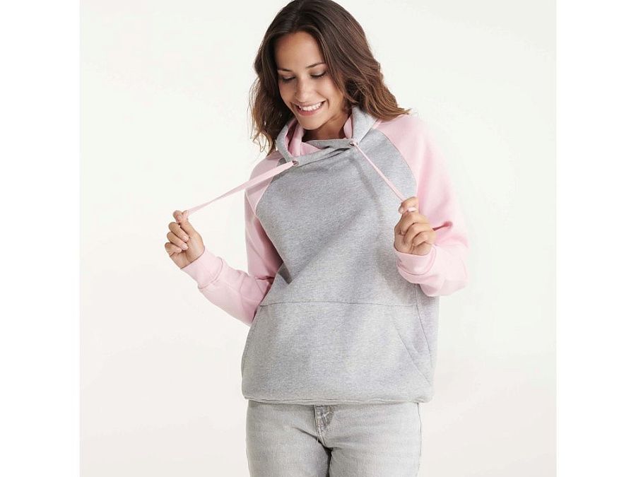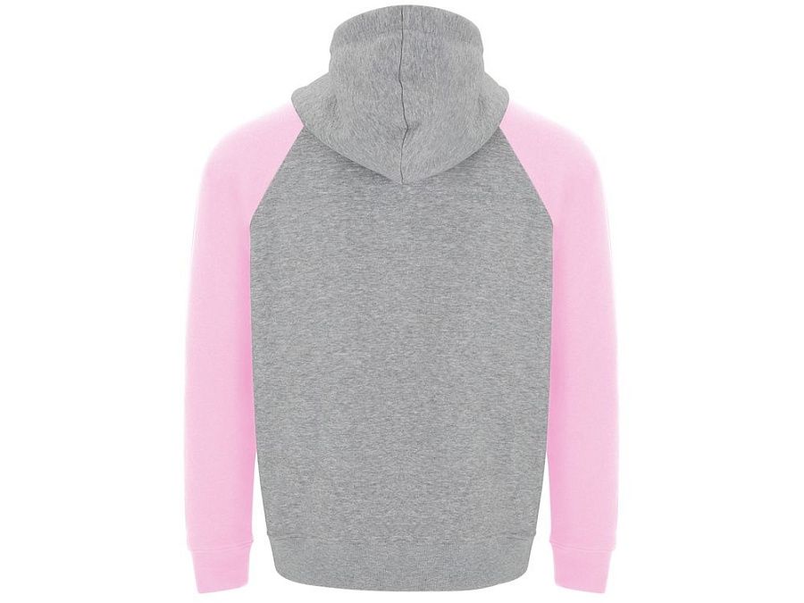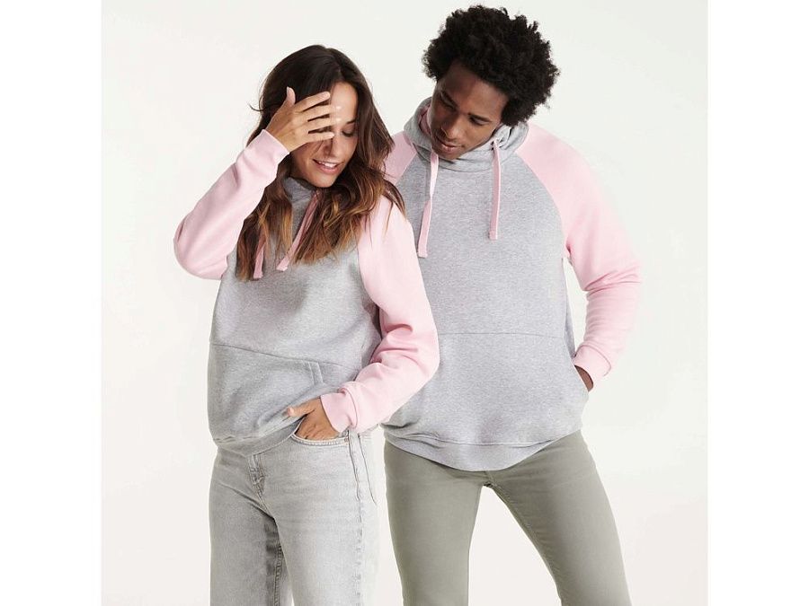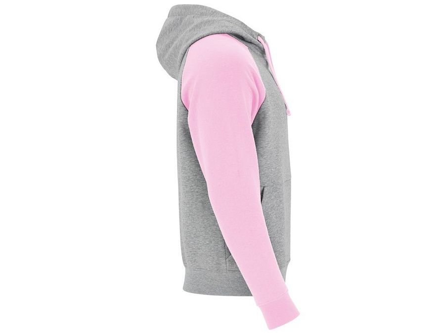 Худи с контрастным рукавом реглан. Капюшон с запахом, с контрастной подкладкой и шнурком. На полочке карман кенгуру. Манжеты рукавов и низ изделия из риба 1х1.