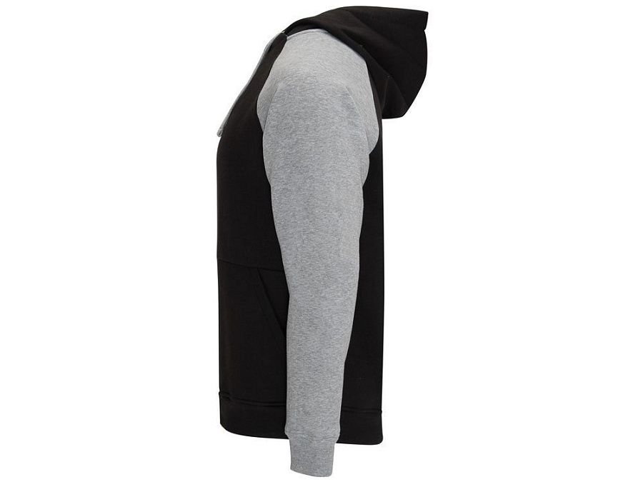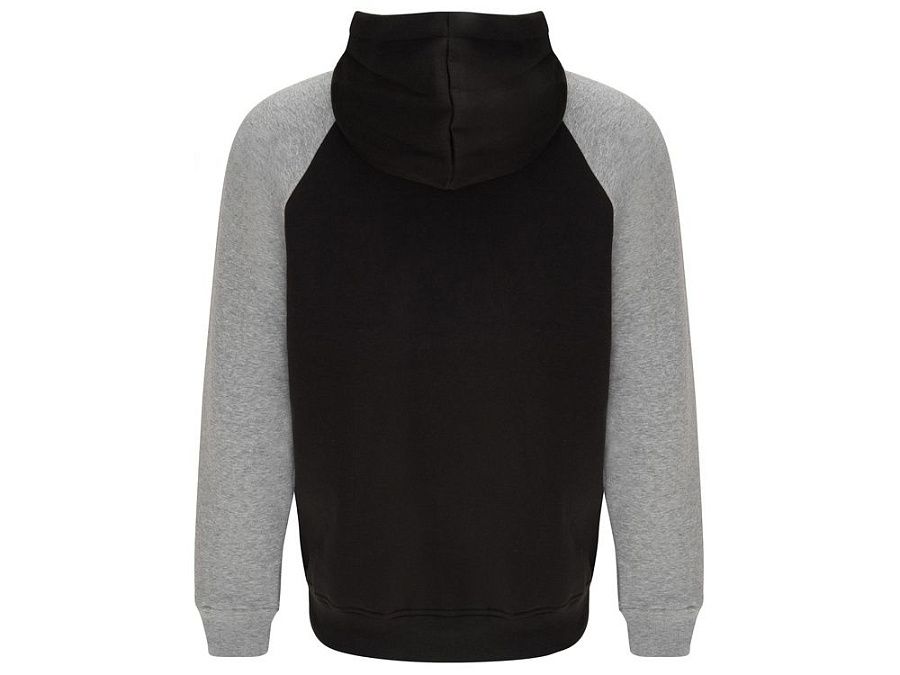 Худи с контрастным рукавом реглан. Капюшон с запахом, с контрастной подкладкой и шнурком. На полочке карман кенгуру. Манжеты рукавов и низ изделия из риба 1х1.