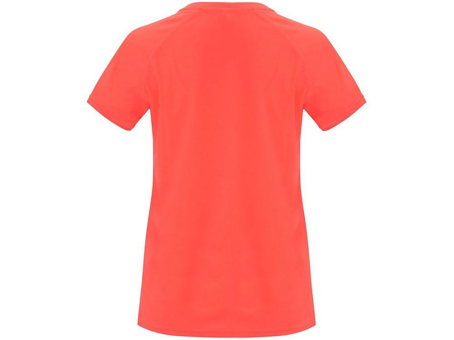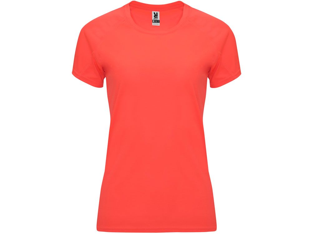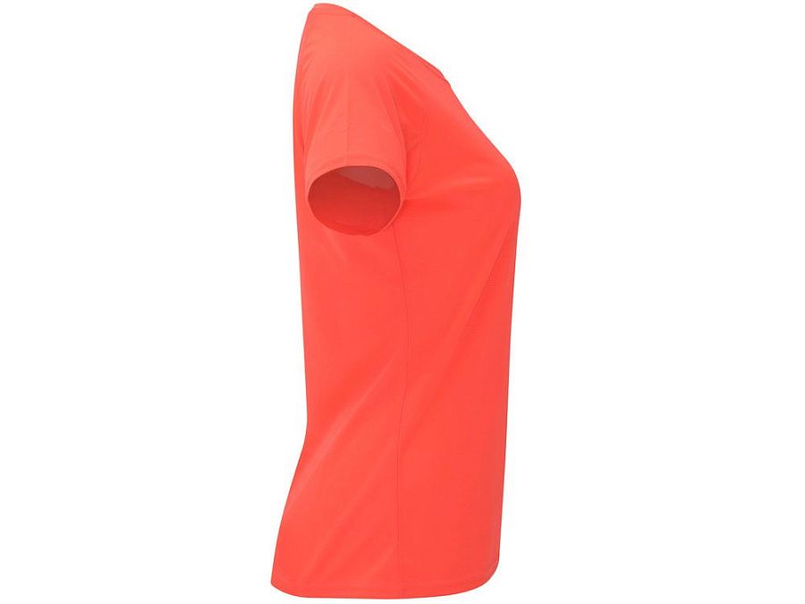 Спортивная футболка с коротким рукавом реглан для женщин. Круглый вырез горловины с отделкой плоским швом. Рукав сложного кроя для обеспечения дополнительного удобства при занятиях спортом. Отделка плоским швом с застилом по пройме и рукавам.