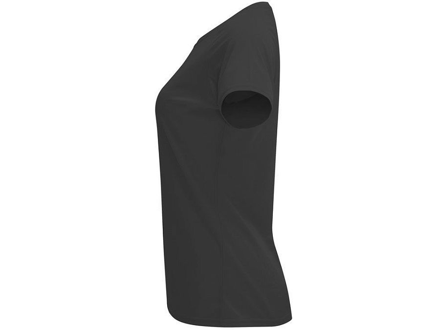 Спортивная футболка с коротким рукавом реглан для женщин. Круглый вырез горловины с отделкой плоским швом. Рукав сложного кроя для обеспечения дополнительного удобства при занятиях спортом. Отделка плоским швом с застилом по пройме и рукавам.