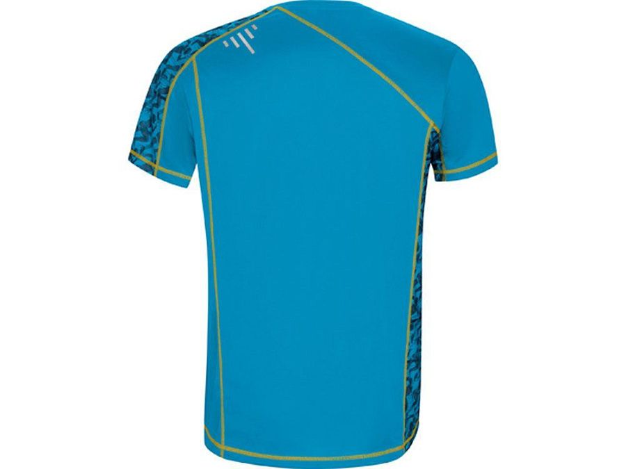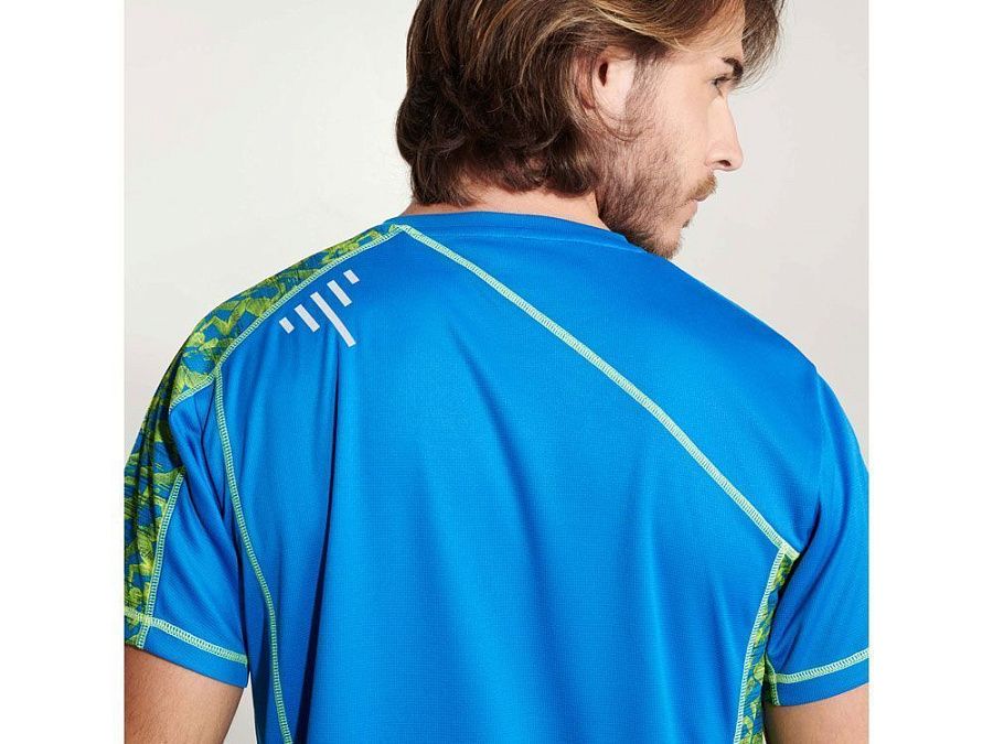 Спортивная футболка с коротким рукавом и принтованными вставками. Контрастные отстрочки плоским швом, светоотражающие элементы на полочке и спинке. Эко лейбл на рукаве.