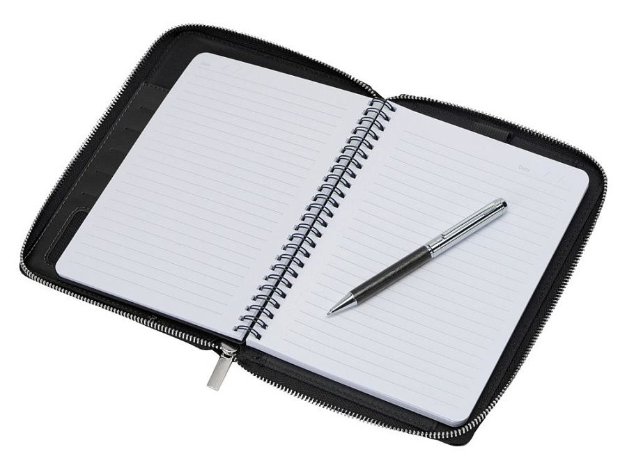 Бизнес блокнот Fabrizio состоит из пенала на молнии выполненного из искусственной кожи, и сменной тетради на 80 листов на кольцах с перфорированными линованными листами белого цвета.