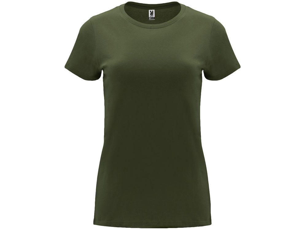 Женская приталенная футболка. Круглый вырез горловины обработан рибом 1х1. Шов горловины укреплен тесьмой.