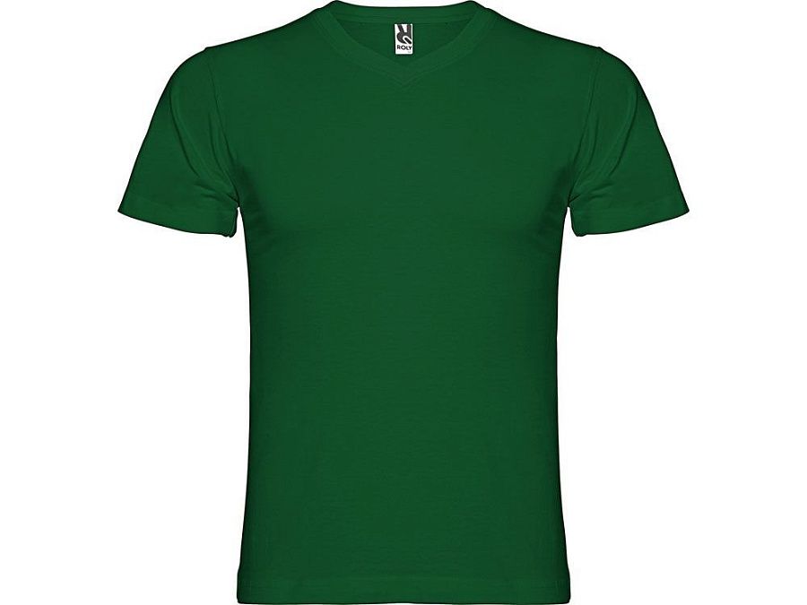 Мужская футболка без боковых швов с коротким рукавом и V-образным вырезом горловины, отделанном рибом 1х1. Горловина и плечевые швы дополнительно укреплены тесьмой.