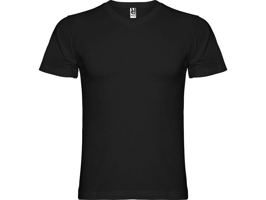 Мужская футболка без боковых швов с коротким рукавом и V-образным вырезом горловины, отделанном рибом 1х1. Горловина и плечевые швы дополнительно укреплены тесьмой.