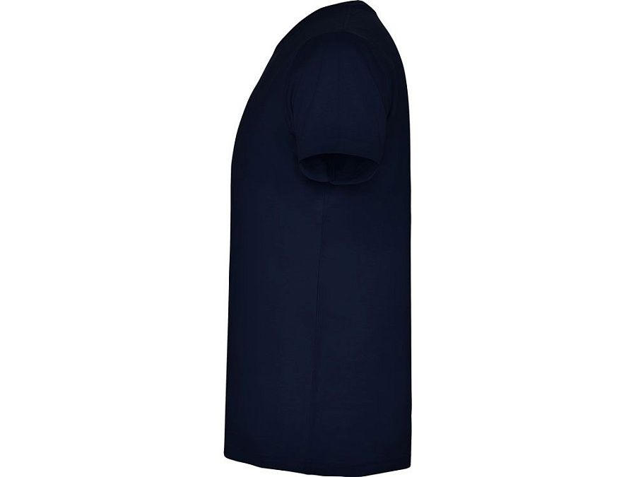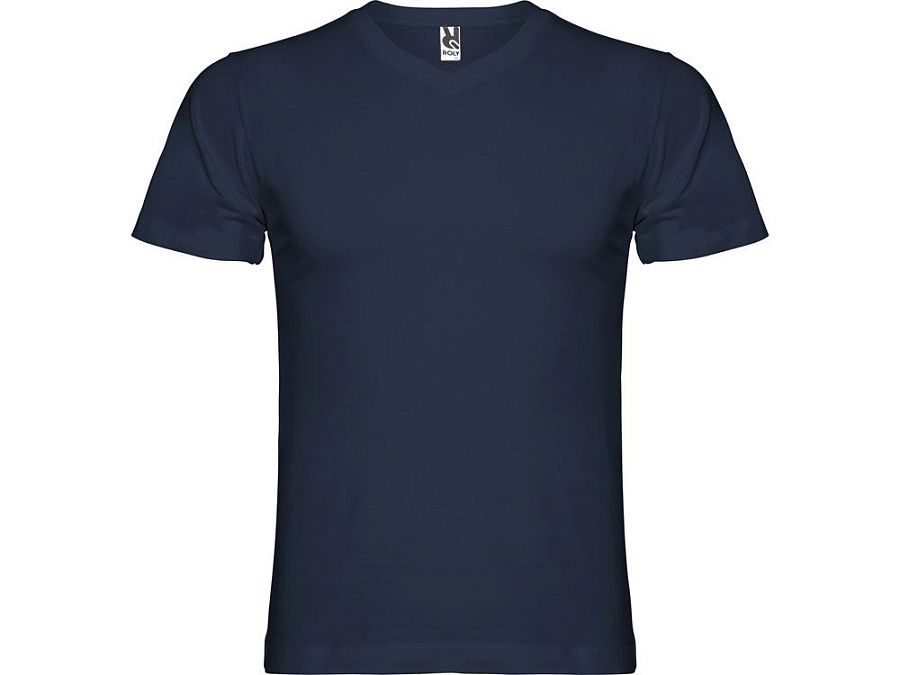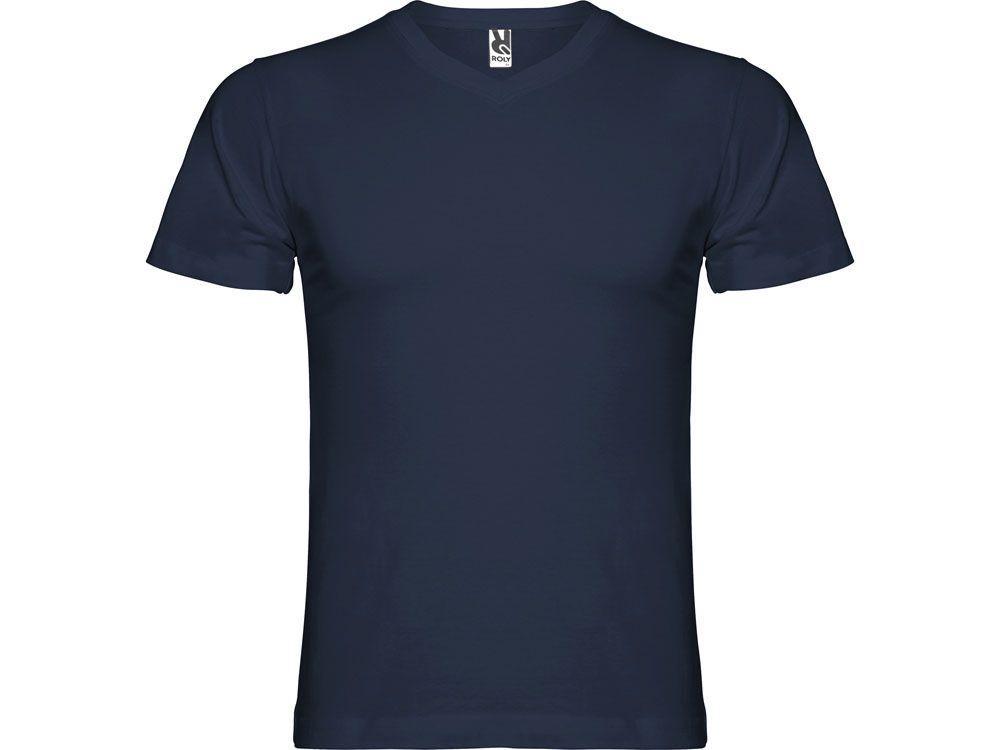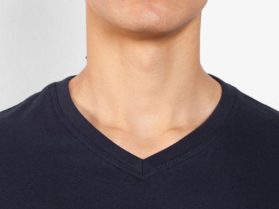 Мужская футболка без боковых швов с коротким рукавом и V-образным вырезом горловины, отделанном рибом 1х1. Горловина и плечевые швы дополнительно укреплены тесьмой.