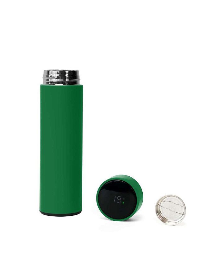 Термос из нержавеющей стали, покрытый цветным soft touch, с крышкой, в которой встроен термометр и LED дисплей, показывающий температуру внутри термоса. Объем: 500 мл. Упаковка: каждый термос в крафт коробке.