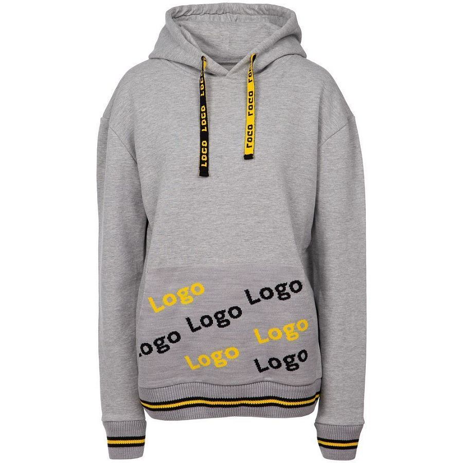 Карман-кенгуру с вывязанным логотипом или индивидуальным рисунком в фирменной цветовой гамме.