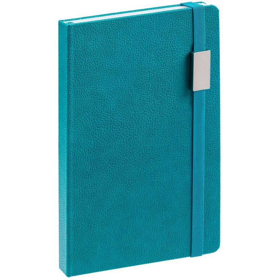 Ежедневник с твердой обложкой, выполнен из материала LaFite, цвет морской волны II, дополнен резинкой с металлическим прямоугольным шильдом и ляссе в цвет обложки.