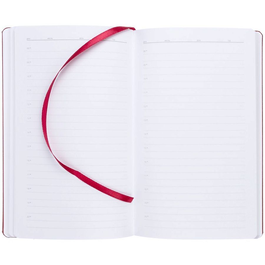 Ежедневник с твердой обложкой, выполнен из материала LaFite, красный РР, дополнен резинкой с металлическим круглым шильдом и ляссе в цвет обложки.