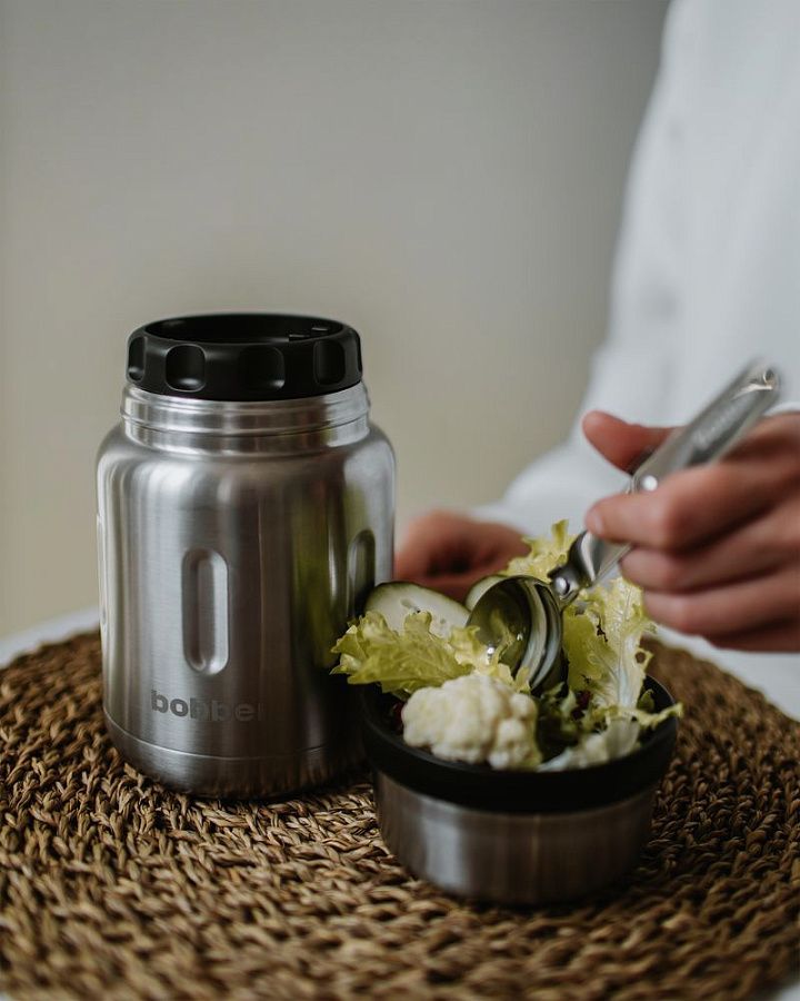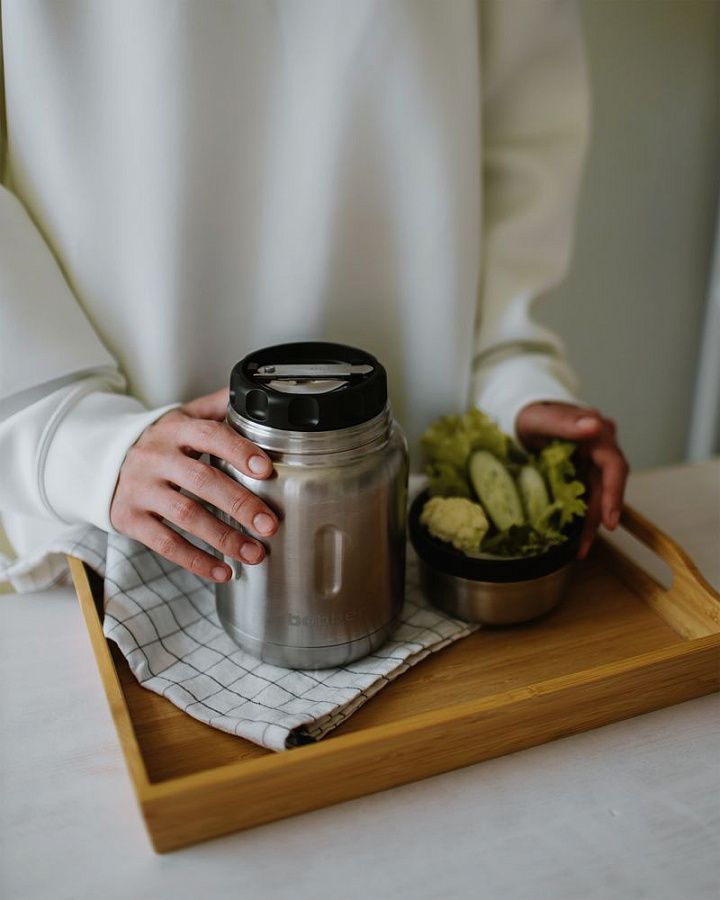 Стальной вакуумный термос для еды со складной ложкой. В нем любимые блюда не соприкасаются с пластиком и остаются горячими надолго.