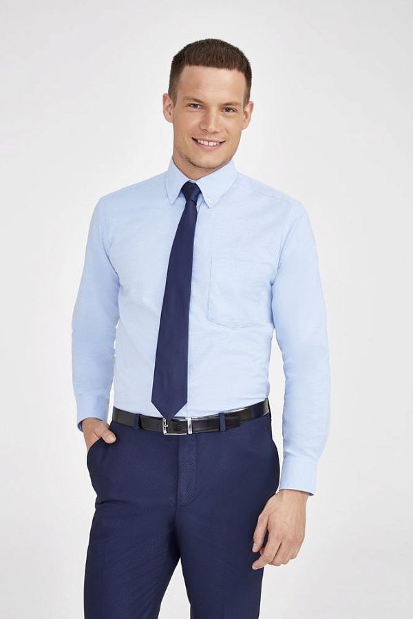 Рубашка из ткани «Оксфорд» с нагрудным карманом слева. На спинке две симметричные складки, воротник на двух пуговицах, регулируемые манжеты, планка с семью пуговицами в тон.