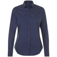 Модная рубашка с печатным рисунком в горошек, которая прекрасно впишется в современный корпоративный стиль.Приталенная модель с нагрудными вытачками, маленьким классическим воротничком, планкой с 7 пуговицами тон в тон и манжетами на 1 пуговице с разрезом «капуцин».