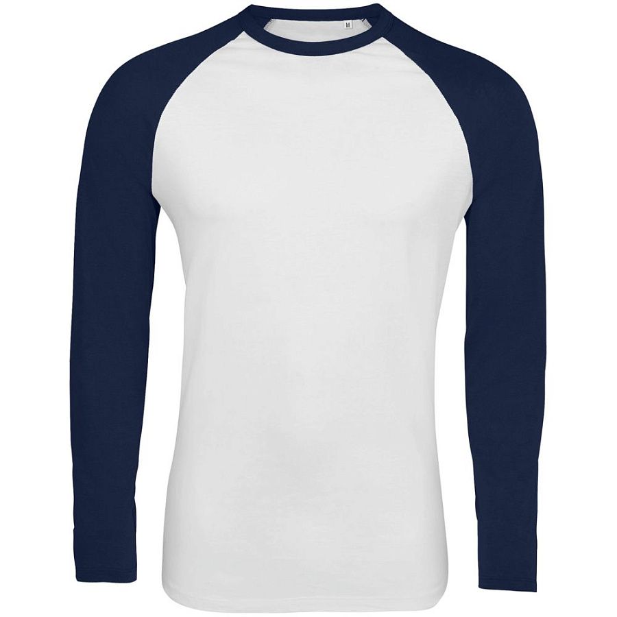 Мужская двухцветная футболка с боковыми швами, длинным рукавом реглан и закругленным низом.