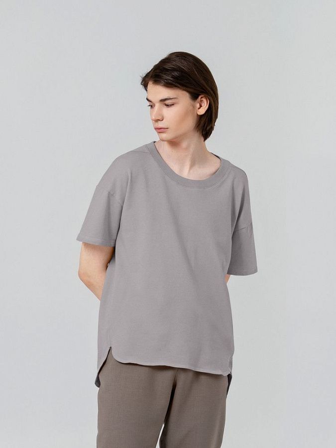 Футболка унисекс свободного кроя со спущенным плечом и смещенными плечевыми и боковыми швами.