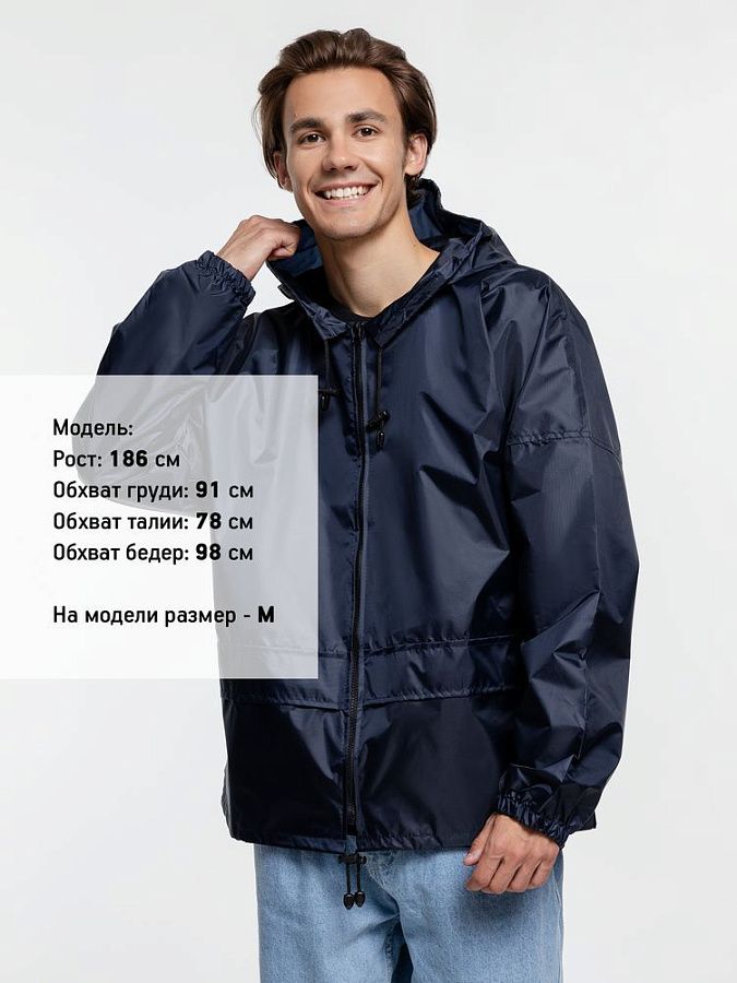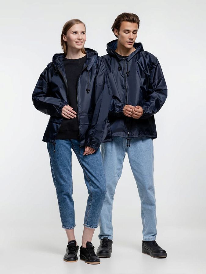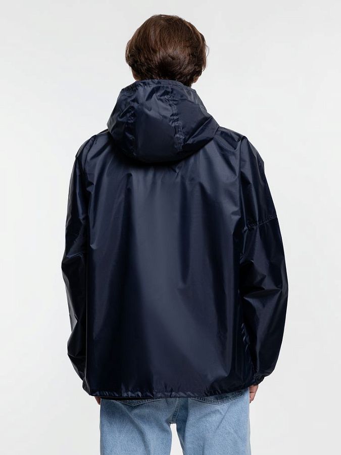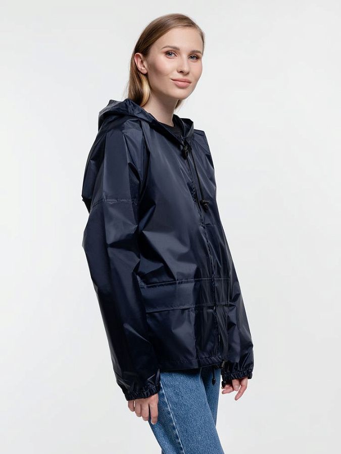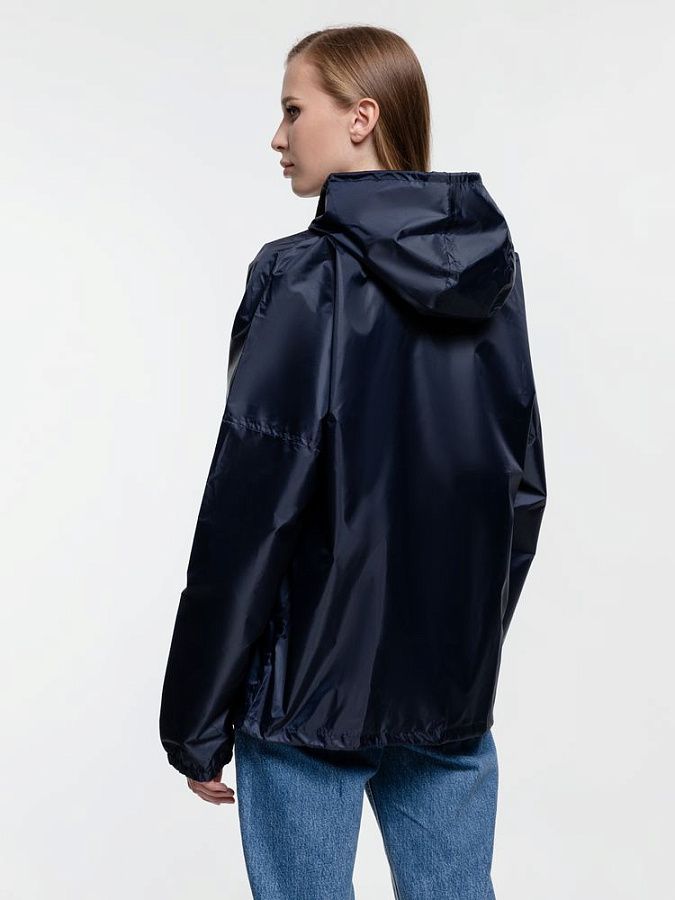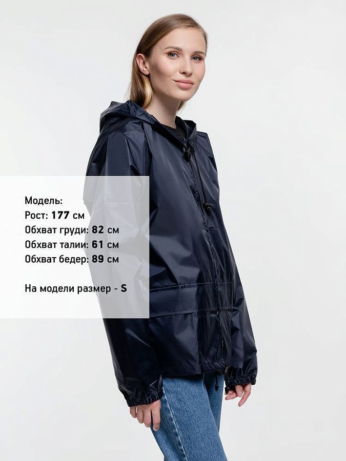 Укороченный дождевик свободного кроя из ткани таффета с влагозащитным покрытием. Складывается в мешочек — удобно брать с собой.