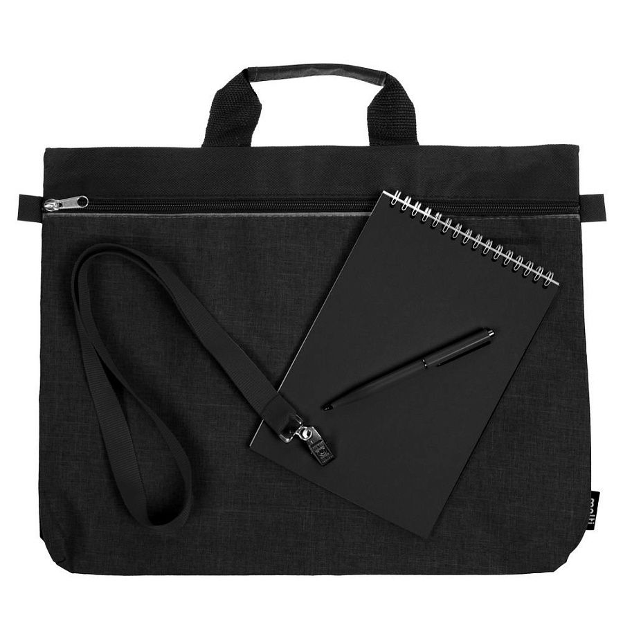сумка - полиэстер; блокнот - картон, бумага; лента для бейджа - нейлон; ручка - пластик, металл