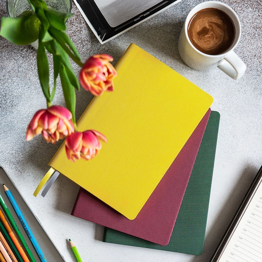Глубокий, насыщенный цвет обложки гармонично сочетается с матовыми серыми форзацем и нахзацем. Скругленные уголки страниц и матовый срез блока, идеально подобранный в тон обложке, добавляют изысканности.