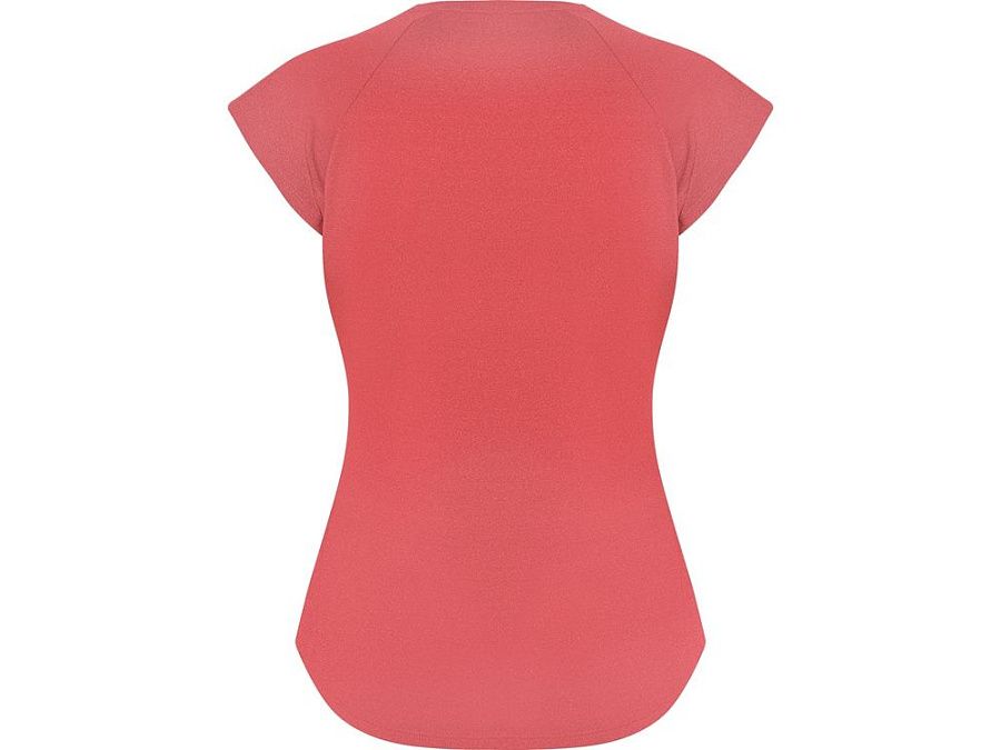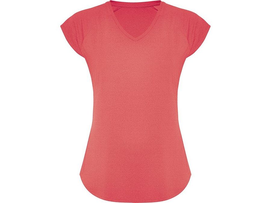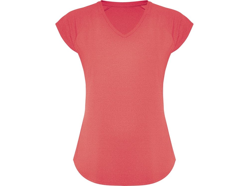 Спортивная женская футболка с коротким рукавом реглан. Вырез горловины V. Полотно из полиэстера на ощупь напоминающее хлопок. Приталенный силуэт.
