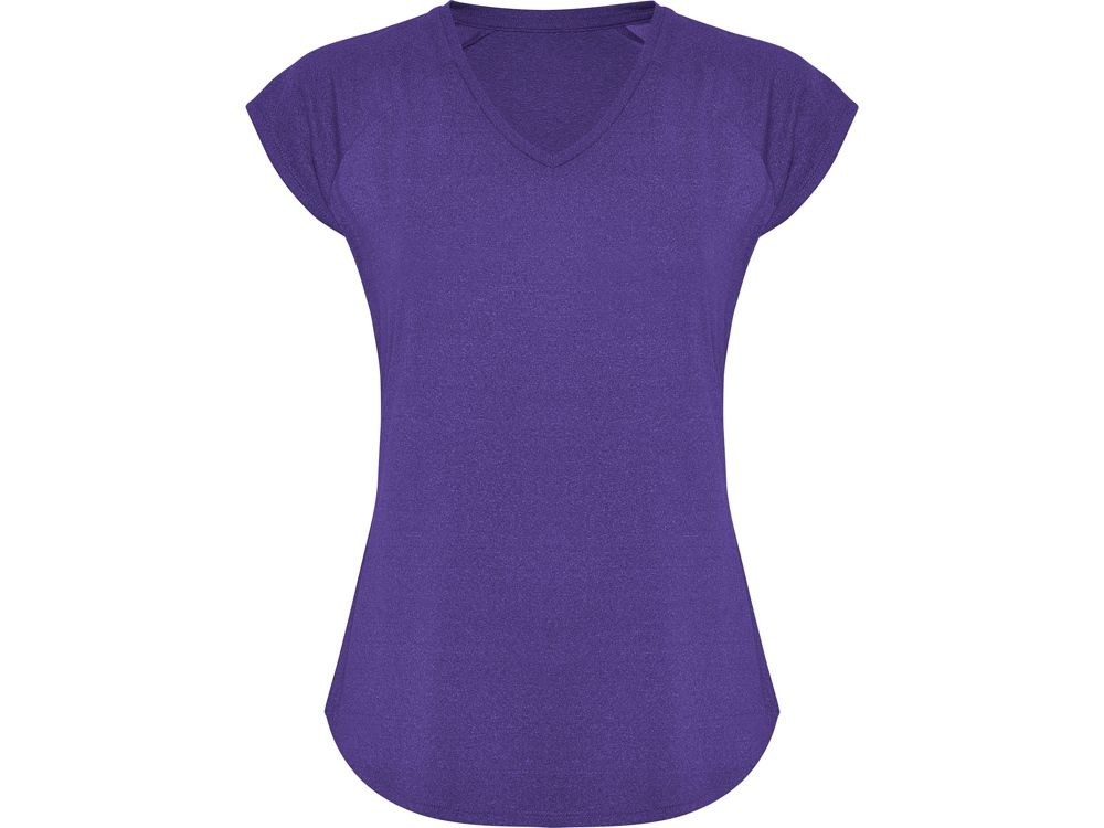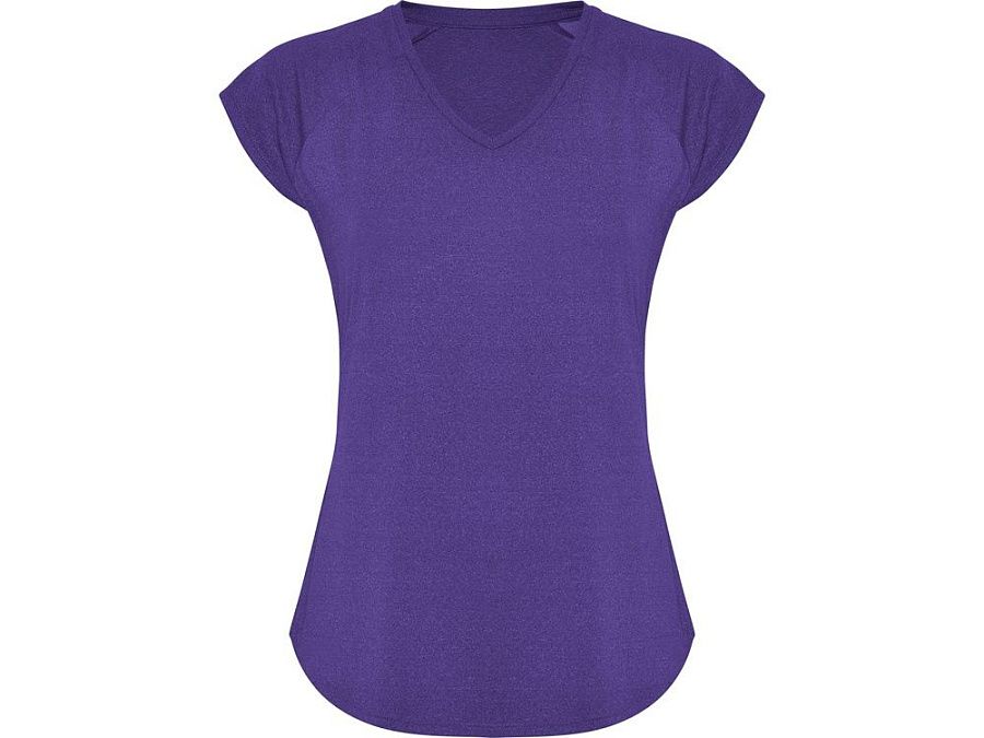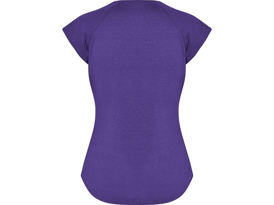 Спортивная женская футболка с коротким рукавом реглан. Вырез горловины V. Полотно из полиэстера на ощупь напоминающее хлопок. Приталенный силуэт.