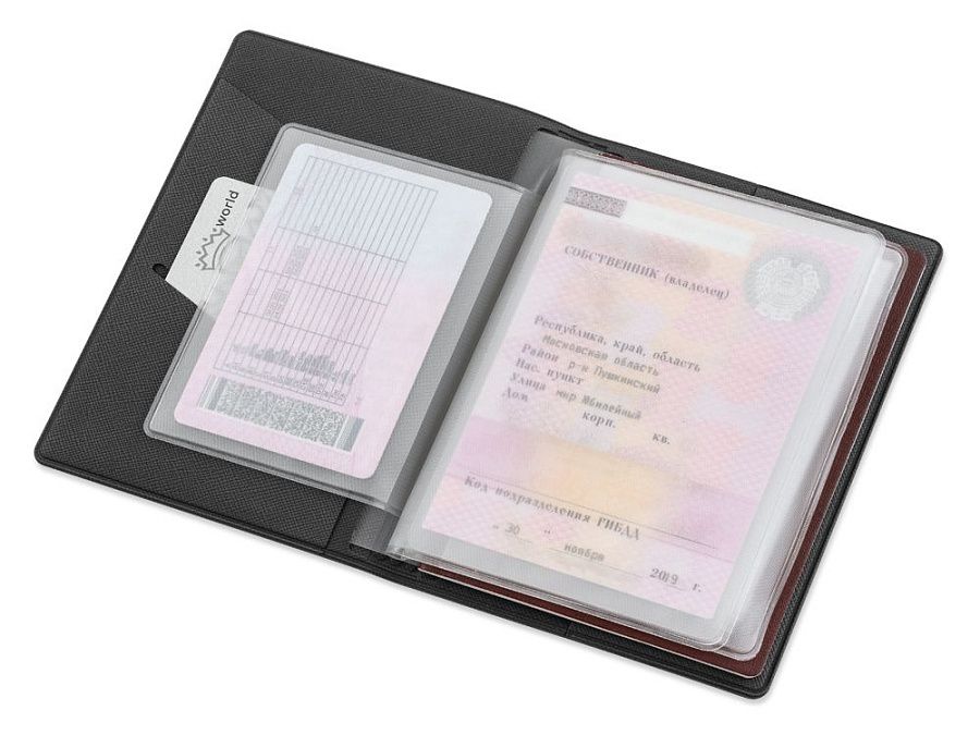 Внутренние вкладыши выполнены из пленки пвх и позволяют разместить: паспорт, свидетельство о регистрации тс, полис осаго, водительское удостоверение, также имеется кармашек для пластиковой карты.
