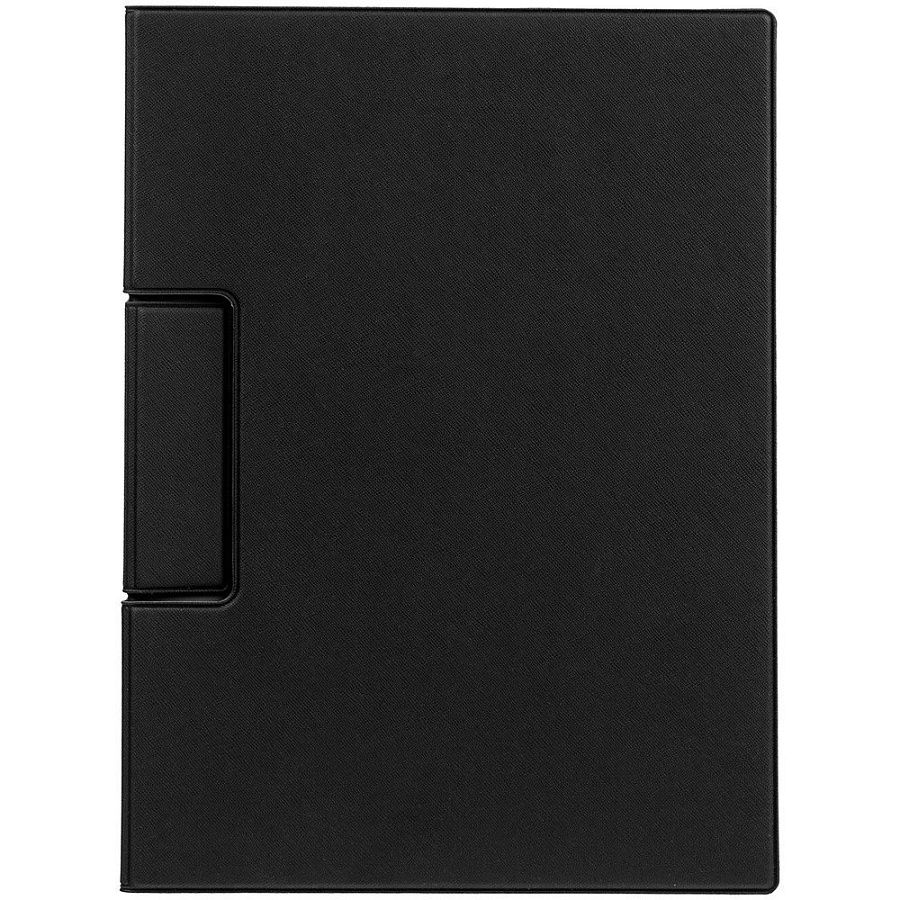 Папку можно использовать в стандартном вертикальном формате или перегнуть обложку и поставить в качестве таблички горизонтально. Магнитный клип удерживает до 10 листов.