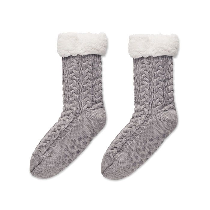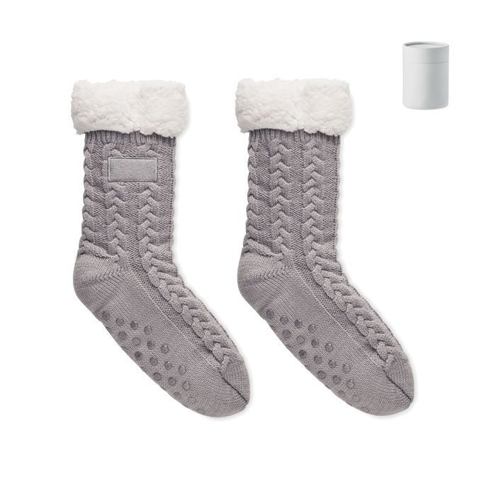 Вязаные носки с нескользящей подошвой из акрила и подкладкой из искусственной шерпы плотностью 240 гр/м². Поставляются в подарочной упаковке. Размер M= 36-39.