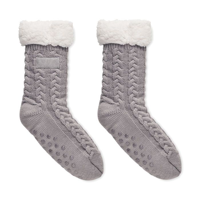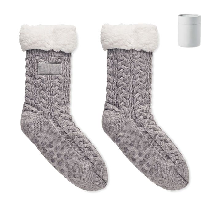 Вязаные носки с нескользящей подошвой из акрила и подкладкой из искусственной шерпы плотностью 240 гр/м². Поставляются в подарочной упаковке. Размер L= 40-43.