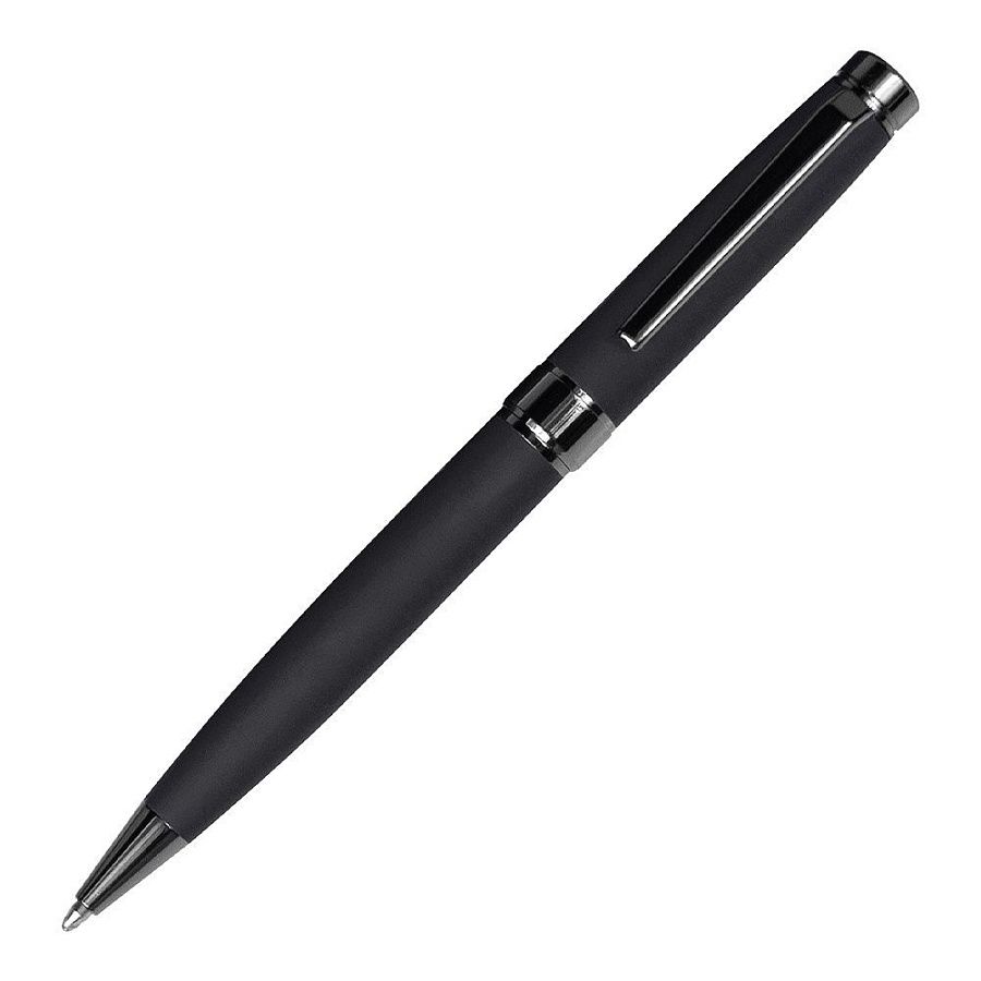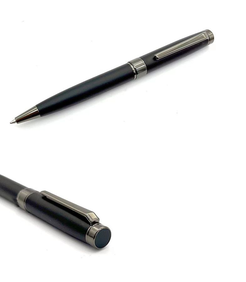 Металлическая шариковая ручка представительского класса с поворотным механизмом. Матовый черный корпус софт тач, темно-серые глянцевые детали отделки. Корпус ручки разбирается, стержень легко заменить. Стержень с синими чернилами типа Parker. Длина письма 1000 метров. толщина письма 1 мм. Вес ручки 32 грамма. Логотип нанесенный методом гравировки будет иметь блестящую серебристую поверхность.