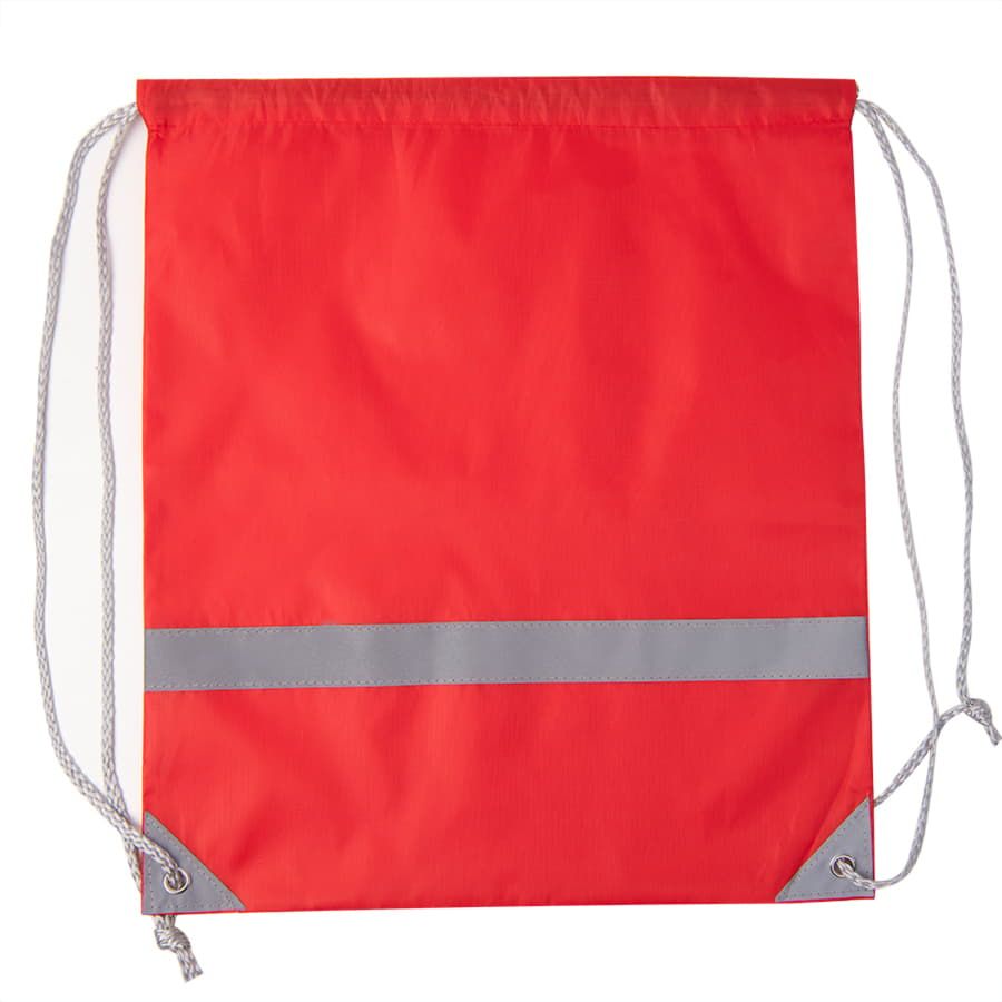 Просто и безопасно! Рюкзак-мешок RAY из полиэстера 210Dсо светоотражающей полосой спереди, светоотражающими уголками,усиленными металлическими люверсамиЛегко и просто затягивается по верхней части серыми шнурами.Красный цвет близкий к Pantone 199C