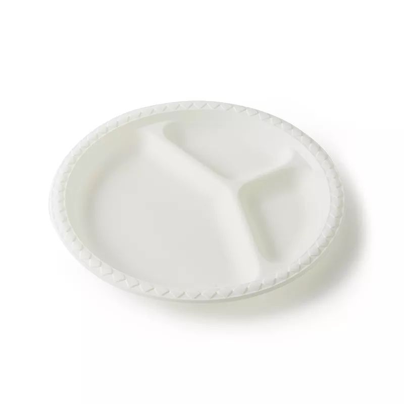 Когда вы отправляетесь на пикник или собираетесь в дальнюю автомобильную поездку, незаменимым атрибутом становятся одноразовые столовые приборы, стаканчики, тарелки и контейнеры. После использования, их можно утилизировать собственными силами без вреда для окружающей среды. Кукурузный крахмал – основное составляющее посуды. Он имеет все необходимые свойства, а также абсолютно безопасен для здоровья человека. Его используют и в пищевой, и в медицинской, и в текстильной промышленностях. Стойкость к разным температурным режимам – одно из важных свойств биоразлагаемой посуды. Такая посуда выдерживает как низкие, так и высокие температуры. Ее можно использовать в микроволновой печи и морозильной камере. Безопасность и отсутствие вредных соединений – основное преимущество посуды из крахмала. Биоразлагаемая посуда не содержит пагубных веществ, не засоряет окружающую среду. Экологичная упаковка для продуктов, которая не выделяет в пищу примесей и запахов даже при нагревании. Круглая тарелка с разделением на 3 зоны из кукурузного крахмала.