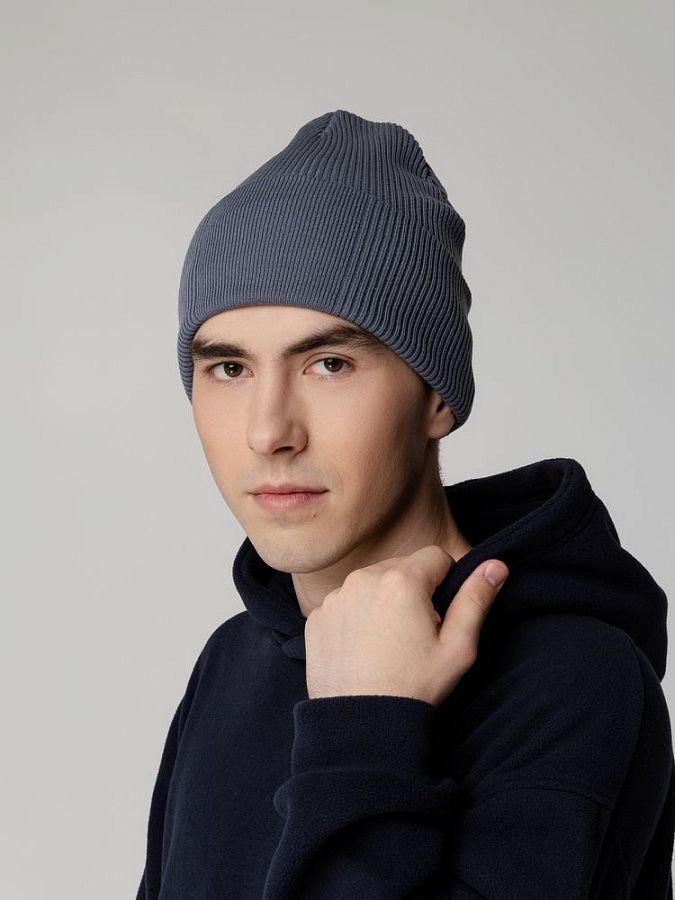 Двухслойная шапка фактурной вязки с отворотом и специальной более гладкой областью под вышивку.
