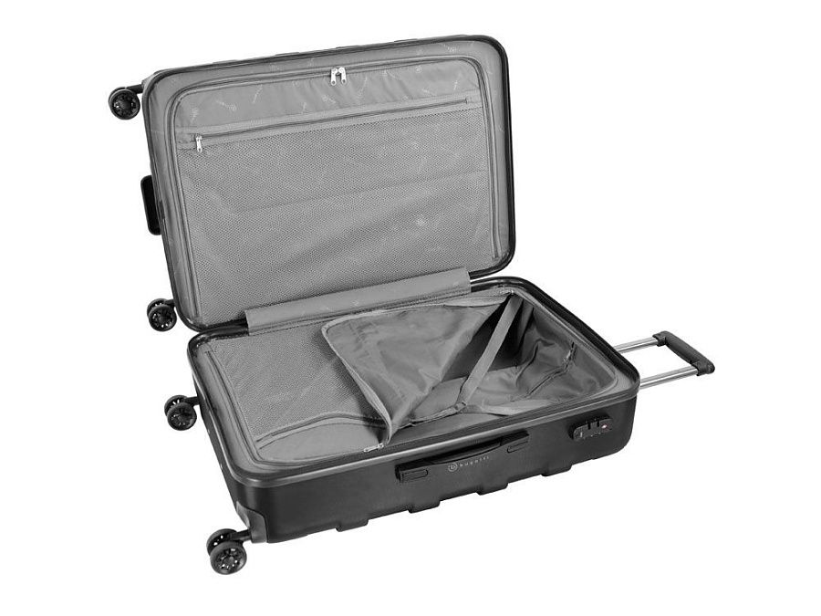 Galatea - наша неповторимая серия чемоданов с рельефно нанесённым на корпус большим логотипом Bugatti. Вся товарная линейка представлена в классическом чёрном цвете. Благодаря корпусу, сделанному из смеси АБС-пластика и поликарбоната, каждая модель отличается лёгким весом и повышенной прочностью. Четыре резиновых колеса с бесшумным ходом и возможностью поворота на 360° обеспечивают ровное движение. Лёгкая телескопическая ручка эргономичной формы фиксируется в нескольких положениях для удобства пользователей с разным ростом. Замок TSA с трехзначным кодом идеально подходит для защиты содержимого багажа от несанкционированного вскрытия. Дополнительная ручка на дне корпуса облегчает загрузку и выгрузку чемодана. Сетчатые разделительные стенки на молнии растягиваются для удобства упаковки, а фиксирующие ремни охватывают большую поверхность и обеспечивают сохранность сложенных вещей.
