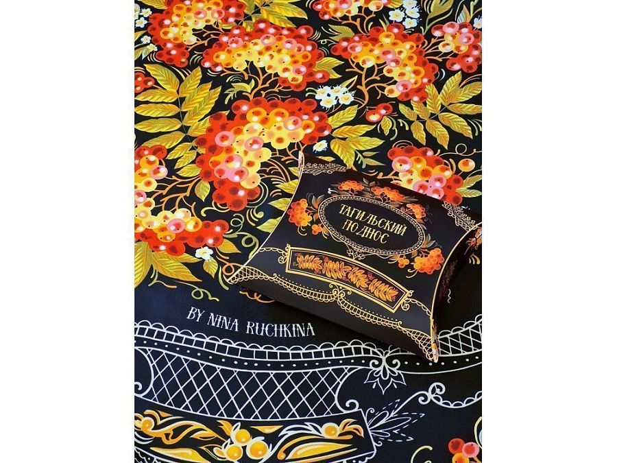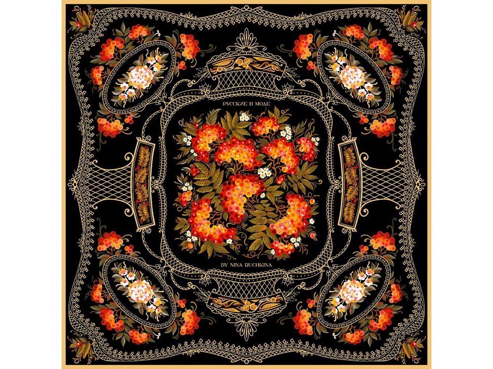 Платок «Тагильский поднос» станет ярким акцентом в вашем гардеробе. Насыщенная терракотово-чёрная цветовая гамма плодов всегда актуальна, а нежные оттенки цветов рябины внесут настроение романтичности и легкости.