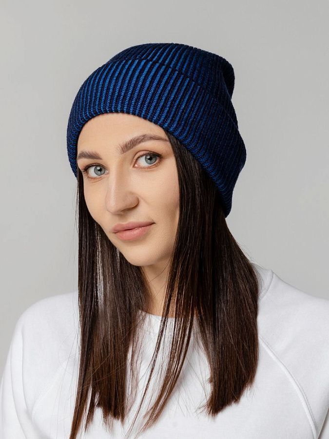 Удлиненная двухцветная шапка из полушерстяной пряжи идеально подходит для создания яркого и современного городского образа и будет удачно смотреться с верхней одеждой разных стилей.