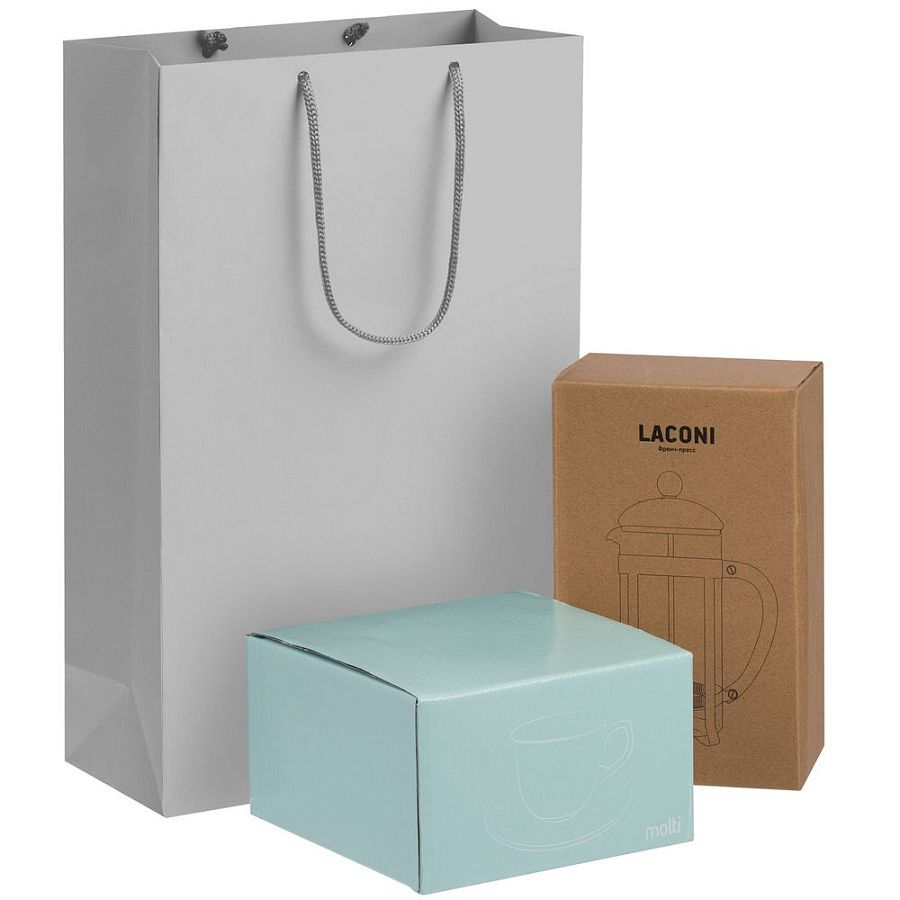 френч-пресс - боросиликатное стекло, нержавеющая сталь, пластик; чайная пара - фарфор; пакет - бумага